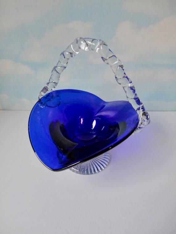 Trending Vintage Cobalt Blue Glass Basket Vintage chrome handles basket with cobalt blue glass dish insert + other bits. Vintage Cobalt Blue Glass Basket / Vintage cobalt blue glass basket with metal base and handle with copper rope.